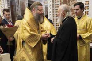 В числе иерархов за Божественной литургией Его Святейшеству сослужил митрополит Тамбовский и Рассказовский Феодосий.