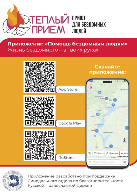 По благословению Святейшего Патриарха Московского и всея Руси Кирилла создано мобильное приложение «Помощь бездомным людям», которое было разработано специалистами социально-реабилитационного центра для бездомных г. Москвы «Теплый прием».