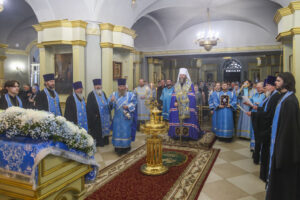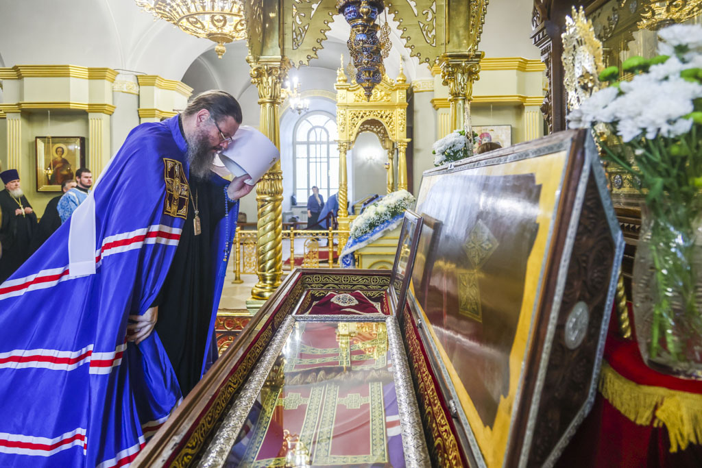 По прибытии в храм перед началом богослужения глава Тамбовской митрополии поклонился мощам святителя Питирима, епископа Тамбовского.